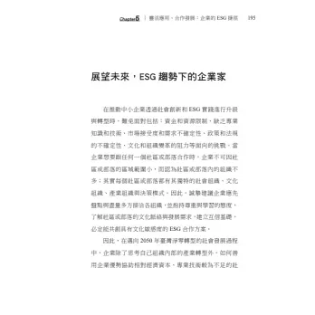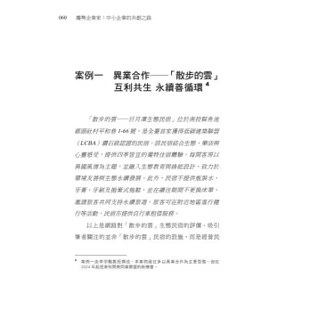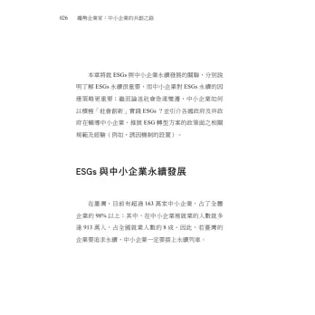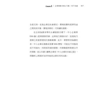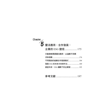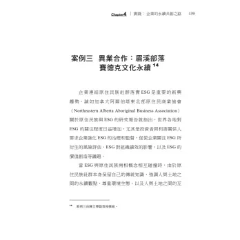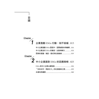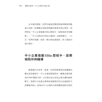 本書檢視剖析三個不同屬性的案例,凸顯各個案例推動永續的緣起、歷程中如何協商解決或調適、為何需要追求ESGs、為何利他是企業未來的出路等。包括: