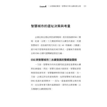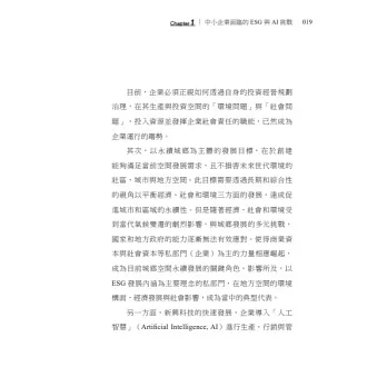 這本書中提到的三個構面—環境、社會與治理—筆者不是要再重複一套ESG 的標準教科書,而是希望從在地案例出發,深入檢視企業導入AI 科技後,在城鄉空間的具體影響與回饋。我們看見,有些企業藉由智慧電網或能源監控技術達成節能減碳的目標;也有企業在大量引進自動化流程後,開始思考如何重新培訓員工、建立更好的心理健康支持機制;甚至有企業重新選擇設廠地點,評估城市的防災能力與數位治理水準,這些都不再只是企業內部決策,而是與整體城鄉發展密切相關的公共議題。