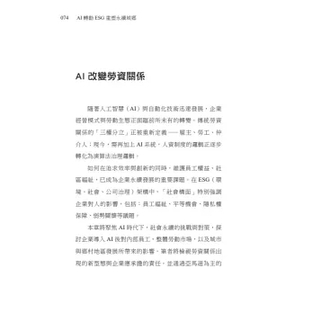 本書的誕生,源於詹中原教授的啟蒙與盛情邀約;而本書的寫作,則從我們在不同領域中的觀察與焦慮開始。長期以來,我與另一位作者分別從事與城鄉政策、勞動議題、數位治理和ESG 評估相關的研究與實務合作。在這當中發現一個趨勢:當企業一方面被期待擔負更多永續責任,另一方面卻又快速導入AI 等技術以提升效率,這兩股力道在現實中常常產生拉扯;除了正面的加乘效果,有時甚至出現矛盾。