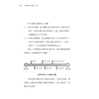 本序最起始的引文中,包含有「生態中心主義」、「代際正義」、「環境不可分離性」、「自然資本不可替代」這些核心精神,這就是與弱永續的最大理念區別(本書將詳述強弱永續理念之差異)。