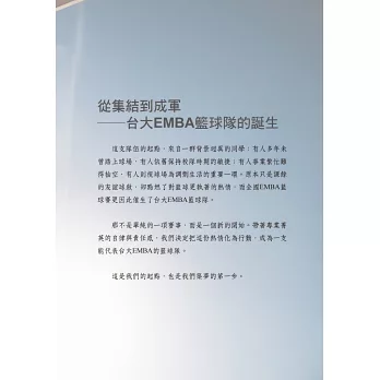 相信這本記錄冠軍之旅的小品,不僅能引發大叔們的共鳴,也能吸引更多熱血大叔加入台大EMBA籃球隊的行列,繼續書寫屬於大叔的傳奇篇章。