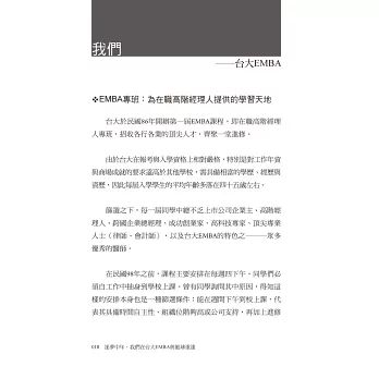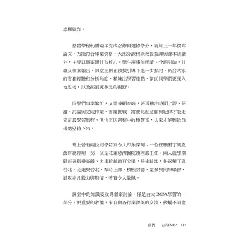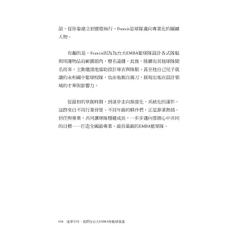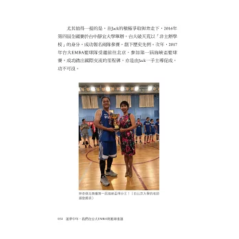 EMBA籃球賽是學校之間的競技較量,不同於多數的籃球比賽都是由青春所譜寫的精彩篇章,EMBA的球員身分是已經邁入中年處在事業與家庭最忙碌的人生階段,大家來自四面八方,各行各業,要能組出一支好的EMBA球隊,背後都是每一個成員許多的取捨、成全和放下:放下自己平時的成就,捨去與家人朋友難得相處的時間。在這一本書裡面,我讀到了許多的「捨我其誰」、很多的「我願意」,這包括了我高中的隊友,我在台大管理學院的學生,還有同為「球爸」的我兒子高中隊友的父親,和許多我欽佩的學長和業界前輩。