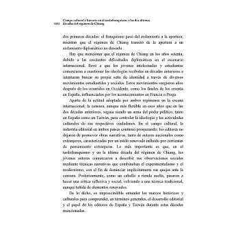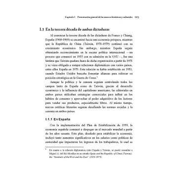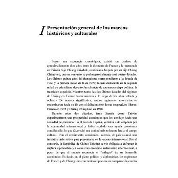 El primer capítulo establece el marco histórico y político que condicionó el desarrollo de los sistemas culturales bajo el franquismo y el régimen autoritario del Kuomintang en Taiwán, dirigido primero por Chiang Kai-shek (1887-1975) y luego por Chiang Ching-kuo (1910-1988). Aunque con trayectorias ideológicas distintas, ambos regímenes compartieron una lógica de control sobre el lenguaje y la representación. La censura —tanto institucional como interiorizada— moldeó las prácticas de autores, editores y lectores, generando un campo cultural jerarquizado, pero no exento de intersticios para la crítica simbólica y la experimentación.