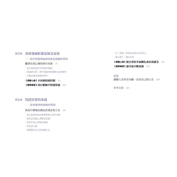傾聽內心聲音、找到自己的核心和價值觀,和內在重新建立建結,將外界對你的過度要求視為雜音,作者在書中舉例並建議可應用的話術+表達語氣,伴你堅定面對總是踩線越界的人們。