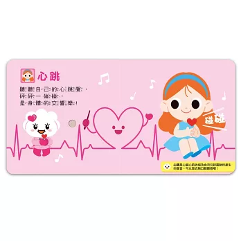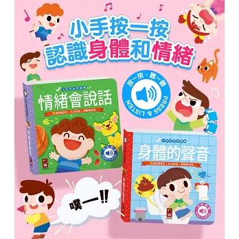 《小手按按有聲書-身體的聲音》,用小手按一按圓形按鈕,第一下聽故事內容,第二下聽生動音效,可愛的插圖完整呈現生活與身體情境,趣味又幽默的音效設計,讓孩子理解身體會發出的正常聲音,一起來聽聽看吧!