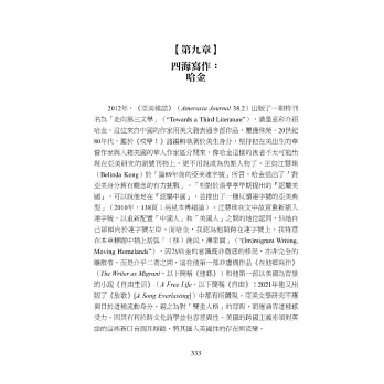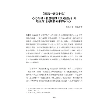 本書開闢華美文學研究的新蹊徑,反饋文學之多樣性及多聲部律動,從本土作家轉至安身立命留美作家的使命感,辨析她們對「母體文化」的反思,分析伍慧明及哈金的章節強化了此書對華美傳統中人文和藝術時刻的召喚和反省。