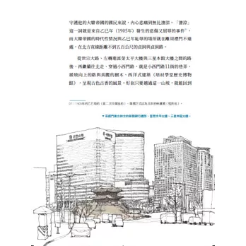本書以繪畫和悠閒漫步的方式,展現首爾的時空。本書以首爾站為中心,透過展現市中心和小巷中那些熟悉的場所,層層疊疊的近現代史,引領讀者重新發現周圍城市空間的人文價值。透過賞心悅目的速寫和繪畫,讀者將重溫這些場所的魅力,同時感受貫穿路線的時空錯落。