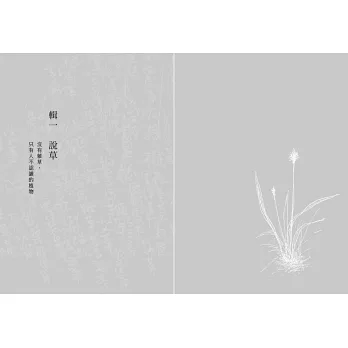 大自然展現生命與存在,有其特殊的方式——無孔不入,既強韌又無為,一隅之地那怕是隙縫,草們都可以找到安家落戶的地方。一般泛泛統稱的草,是一個偉大而龐雜的群族,它們以啟山林,無畏於石罅岩盤,扎根深化土地,為森林之先導,亦為蟲魚鳥獸獻上禮物。