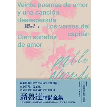 智利詩人聶魯達不只是一九七一年諾貝爾文學獎得主,也是二十世紀最偉大的拉丁美洲詩人。他的情詩享譽全球,從初戀到末戀,從青春到中年,不變的熱情與眷戀,跨越愛與死,永恆與當下。本書完整收錄聶魯達創作的三本情詩集,包含《二十首情詩和一首絕望的歌》、《船長的詩》、《一百首愛的十四行詩》,由詩人陳黎與張芬齡精心譯成,看見聶魯達筆下,愛情並非全然的浪漫甜美,儘管帶有苦澀,卻是唯一可與死亡、挫折、孤寂等人世黑暗相抗衡的力量,在光與陰影間,構築永恆的愛的共和國。