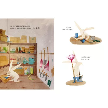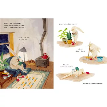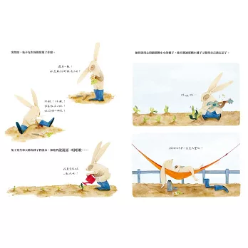 紅蘿蔔的造型討喜,頭上飄著幾瓣深綠淺綠的葉子,圓滾滾的身軀,可愛極了!紅蘿蔔和兔子的田園生活也畫得維妙維肖,整本書有一種閒適的優閒氛圍。呼應著培養友誼這件事,其實是需要以古樸的、原始的方式進行才行。紅蘿蔔原本是兔子的食物,在作者的巧思安排下變成了好朋友,也是隱喻著好朋友是我們不可或缺的精神食糧吧!