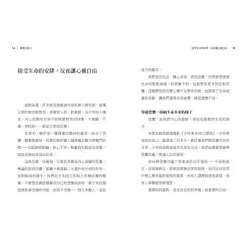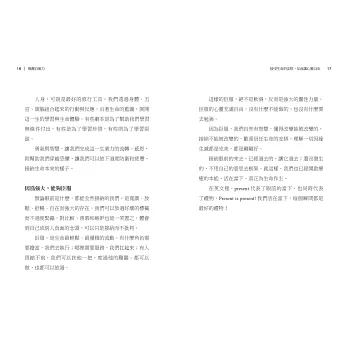 本書選輯的文章充分反映現代人的困境,也帶來解答──幫助讀者從接受現況開始,透過呼吸統合身心,在五官和頭腦的日常體驗,以感恩點點滴滴轉動心情,放過個人的侷限和痛苦,擁抱更廣大的生命觀點,活得圓滿,活得快樂。
