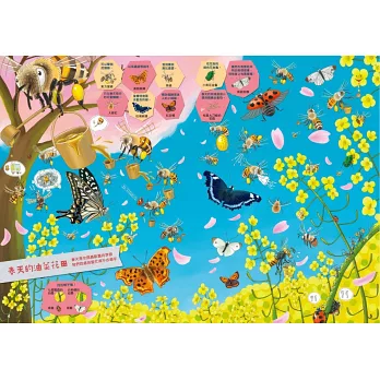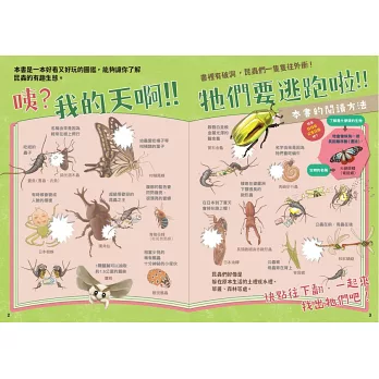 咦?書裡有破洞,昆蟲們一隻隻往外衝!我的天啊!!牠們要逃跑啦!!這次要跟昆蟲們玩躲貓貓遊戲,發揮你的觀察力,把牠們都找出來吧!昆蟲們好像是躲在原本生活的土裡或水裡、草叢、森林等處,在不同季節也可以發現不同種類的昆蟲身影喔!有喜歡吃紙的蠹魚(書蟲、衣魚)、散發白金般金屬光澤的寶石金龜、超級受歡迎的昆蟲之王獨角仙、受到農民無比喜愛的熊蜂、被抓到會吱吱叫的星天牛、看起來有毒但其實沒有毒的斐豹蛺蝶、連葉脈也模仿得唯妙唯肖的巨人葉脩、看起來像小丑的赤緣人面椿象……等,超多新奇有趣的昆蟲知識,等你來發現!