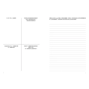 這本獨樹一幟的練習簿中,有些頁面是一個題目一頁,有些頁面一分為二,有些則劃分為三格或四格,各有三或四個小題目。要用文字表達,還是隨性塗鴉,皆由當下的心情決定。