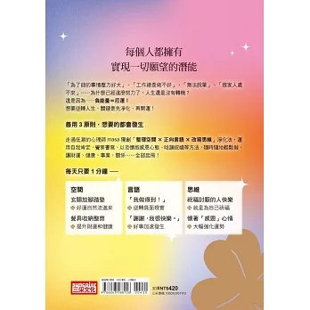 這套「三位一體淨化法」是執行「整理」、「言語」與「思維」三個關鍵的淨化方法,每一項都不難,只需要照做就能夠自行消除負能量。