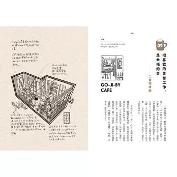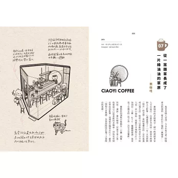 這次挑選了38間Ker Ker心中的寶藏店,可能不是最新、最好拍或最有話題,多半是一人店,或由情侶夫妻一起經營的獨立小店。第一手採訪老闆們的創業血淚,浪漫與現實交織的真心話,對於咖啡、空間及經營的想法。佐以精細的手繪透視插圖和氛圍感滿滿的照片,為每間咖啡店留下各種可愛的空間細節。