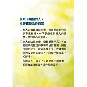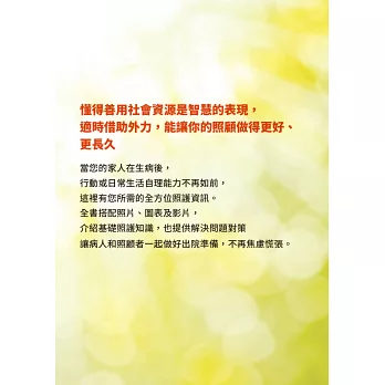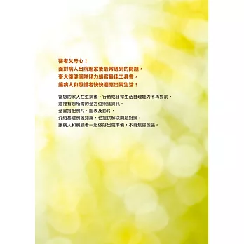 ★內容精煉實用,一看就懂!從輔具選擇、潔身、如廁、進食、用藥、睡眠、情緒調適到管路照顧等,一應俱全!提供最立即需要的正確照護知識,搭配示範圖片和影片,方便照顧者隨時學習和複習。