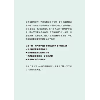 不談艱深理論,不限疾病類型,只要是病後失去行動力或日常生活自理能力的人或其照顧者,都能從本書找到需要的重要資訊。全書搭配照片、圖表及影片介紹基礎照護知識,也提供解決問題的對策,如補助申請管道、危急情況的辨識、管路清潔和更換,以及理解病人和釋放照顧者情緒的方法等,預先為病人和照顧者做好心理建設,特別是當遇到問題時,立刻就能翻開學習和複習。