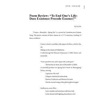 進一步看這本詩集,比較沒有情色寓意的詩作,詩中人面對的自我大都是「孤獨」與「哀傷」,只能「收割天空的彩虹」。眼前是泰戈爾銅像,浮動的意念是「詩在你鍛鑄的瞳孔裡默默流淌」。意識到卡謬已死,「雪花,像鴿子羽毛在空中盤旋」,落在「狂亂又哀傷」的街道。人世間到處是「蛇蛇蛇」,「九拐十八灣的蛇行/以華麗的鱗片偽裝世相/薄唇一張,信口雌黃」。
