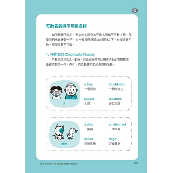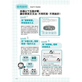 簡易的文法用簡單的「單圖」輔助說明!以往學文法時總是學了又忘,那是因為純文字的學習效果有限。在較簡易的文法說明時會搭配簡單的單圖,獨特的圖像式記憶法讓你學得快、記得牢!