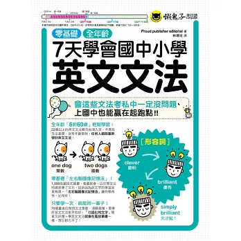 22 個以上的英文文法概念由淺入深,從名詞、動詞、形容詞,到時態、句型、語氣及字首字尾,不用任何基礎,也不用死背規則。全書以「生活例句+圖像記憶」方式呈現,不論是學生、家長還是成人初學者,都能重新學好英文文法!