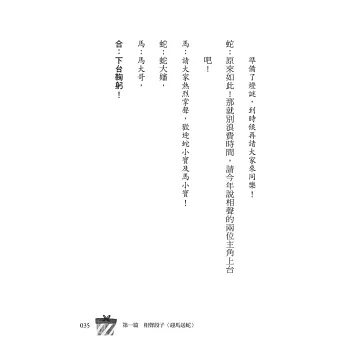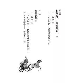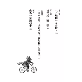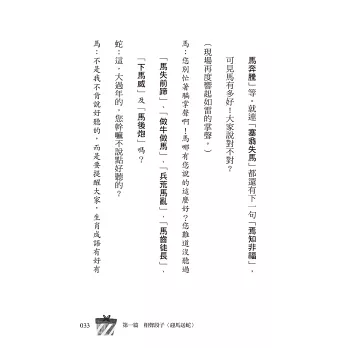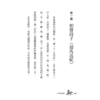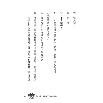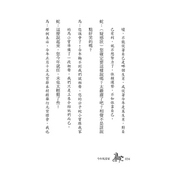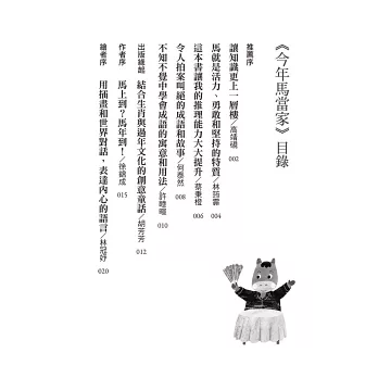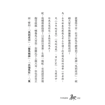★希望這本書,不但讓讀者更瞭解關於馬的各種文化象徵與馬年故事,也可以應用在生活上。譬如新春期間拜年,來一句「馬到成功」、「一馬當先」或者「龍馬精神」!或者寫作文時,來一句「塞翁失馬,焉知非福」,因為它讓我們對於不如意的事情產生了新的眼光。不用怕別人不懂,如果有人不懂,那正好可以向他們解釋解釋。