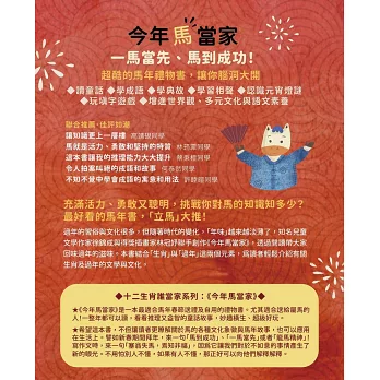 ★《今年馬當家》是一本最適合馬年春節送禮及自用的禮物書。尤其適合送給屬馬的人!一整年都可以讀,看看推理又益智的童話故事,妙趣橫生、超級好玩。