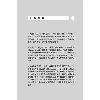為紀念辛波絲卡這位諾貝爾獎詩人的百歲誕辰,本書特別集結了她全部的詩作:從出道之作〈我在尋找字〉到十四部詩集,連同迄今尚未出版的詩篇,悉數收錄。每章開頭都標明本次重刊所依據之版本,以及該詩集首次出版的日期。那些在收入詩集前曾先刊於報刊的作品,則在作品下方附上最初刊載來源。
