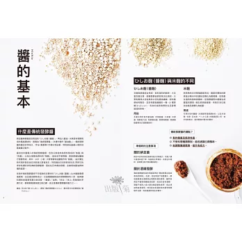 本書以「ひしお麴(醬麴)」為材料,用非常簡單易學、保存性高的方式製成16 種發酵醬,包括: