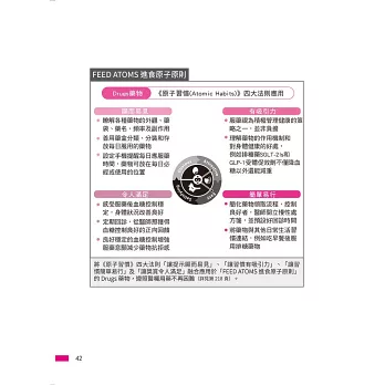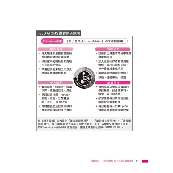 此書理念「FEED ATOMS 進食原子原則」與「漸進式低醣飲食」,完美融合「原子習慣」之行為科學實踐方法,將複雜理論化為能夠簡單執行的日常,累積每日微小改變,控糖減重穩健達標,是值得推薦給醫護同仁及病人的實用指南。──盧佳文/台大醫院家庭醫學科副教授、台灣肥胖醫學會理事