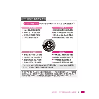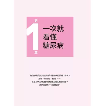 本書內容涵蓋糖尿病成因、預防與控制,理論與實務兼具,簡潔精粹,值得參考。作者自創糖尿病控制口訣,易於應用,納入原子習慣,輔以連續血糖監測(CGM)實測數據,更具行為改變之說服力,為難得一見的好書。我樂於推薦。──陳俊傑/中山醫學大學附設醫院職業醫學科主任、中山醫學大學家庭醫學科教授