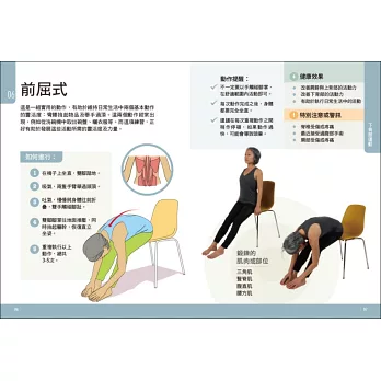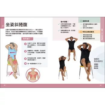 書中大多數運動都會有建議的重複次數或組數,請依自己的情況而定,可適時減少重複次數或組數。