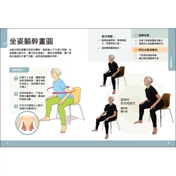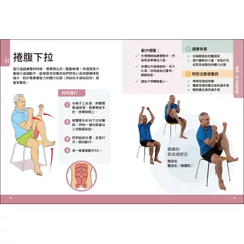 本書多數運動皆採坐姿完成,這些動作搭配結實椅子作為支撐,有助於進行平衡練習。平衡訓練在日常運動中經常被忽略,其實對老年人而言,可降低跌倒風險的平衡訓練,特別重要。