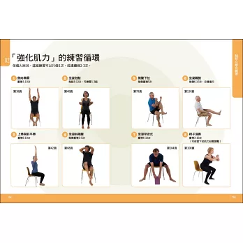 椅子運動可強化肌力,對於獨立完成日常活動,肌力不可或缺。在肌力訓練中,我們必須讓肌肉達到接近極限的負荷,這樣才能有效刺激目標肌群的生長與發展。本書提供許多肌力鍛鍊的練習,請記住,在增加運動量時,務必緩步開始、循序漸進。