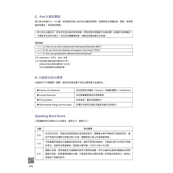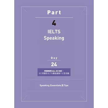 寫作部分聚焦Task 1圖表題與Task 2論說文結構;閱讀包含是非、配對與摘要題;聽力依四大Section分析題型與答題策略;口說則從Part 1日常問答到Part 3延伸討論皆有實戰指導。