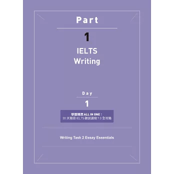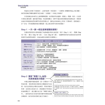 全書依照雅思四大領域規劃了為期4周的系統化進度表:寫作(Day 1~12)、閱讀(Day 13~18)、聽力(Day 19~23)、口說(Day 24~28),建議學習者每天按部就班地依照章節順序完成學習與練習,若進度過於緊湊,也可依自身情況調整,穩定且持續的學習節奏比短時間的密集衝刺更有效,唯有每日堅持,才能在4週內培養真正的實戰力。