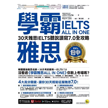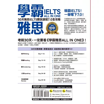 每天都有明確目標與實戰練習,讓學習者穩紮穩打地累積應試力,在短時間內突破瓶頸,現在就讓《學霸雅思ALL IN ONE》成為你準備雅思考試的總結!