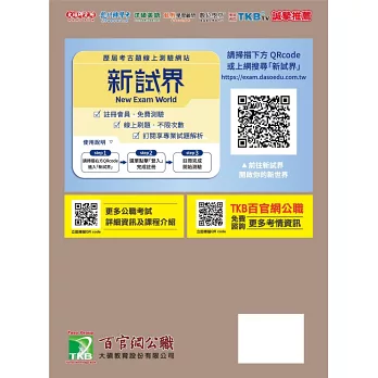 1.每一本書皆收錄該科目的歷屆考題及詳解,讓考生不需費力地上網爬文找歷屆試題,只要一本試題大補帖在手,便能立即實戰演練,並且有效整理歷屆考試重點,作為考前衝刺複習書。