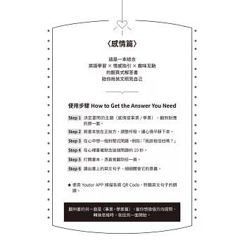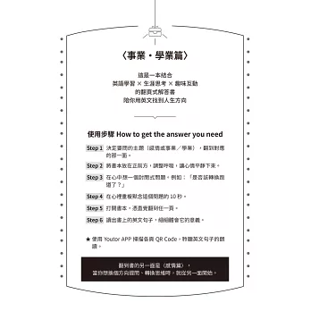 《英文解答書:用英文解決人生大小事》是一本結合英語學習 × 情感指引 × 生涯思考 × 趣味互動的翻頁式解答書。左翻是〈感情篇〉,右翻是〈事業・學業篇〉。想問哪一類問題,就從哪一面開始。