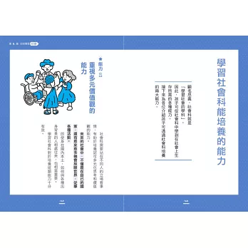 第2章之後分別針對國語、數學、社會、自然,分析學習各科目可以培養出的核心能力,這也是人們終身受用的能力;並進一步具體介紹什麼樣的體驗有助於學科的學習。