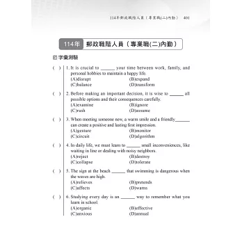 要能掌握考試的得分關鍵,除了平時的努力、熟讀課文內容外,最重要的是練習歷屆考題,因此本書在書末收錄了收錄中華郵政近年試題,題題均由名師為你詳盡解析,可藉由老師的解析來理解考試的重點與脈絡,如此一來,在考場上更能得心應手,獲取高分﹗