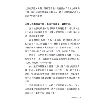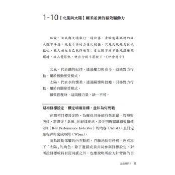 在第一章,您會看到績效管理的基礎架構。例如藉由《賣火柴的小女孩》理解願景與使命是績效管理的指北針。以及《下金蛋的鵝》提醒目標設定需結果與行為目標並重,才能避免出現偏頗文化。