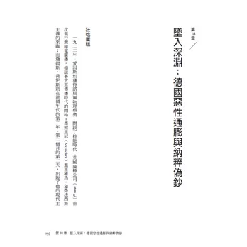 一戰後的德國,通膨讓一個雞蛋的價格飆升到幾十億馬克。海明威看著法國人過境狂吃廉價蛋糕,看著貨幣崩潰摧毀中產階級,為希特勒的崛起吹響號角。納粹後來在集中營裡,策畫了史上最大規模的英鎊偽鈔行動。──第18章〈墜入深淵:德國惡性通膨與納粹偽鈔〉