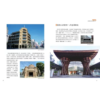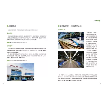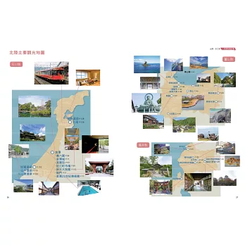 在這本書裡,Aska就像是位稱職的嚮導,從最基礎的「認識北陸」開始,讓讀者在攤開日本地圖的同時,就能清楚的將北陸區分出來;接著他從交通切入,教導我們如何善用交通票券來暢遊北陸地區;最後再用大量的篇幅來介紹北陸三縣好玩、好吃、有趣的景點。大家耳熟能詳的金澤、合掌村、立山黑部、飛驒高山等,都在北陸。合掌村是個美到讓人會倒抽一口氣的世外桃源;立山黑部每年4月的開山也總是吸引大批的朝聖人潮;至於有小京都之稱的金澤,更是喜愛古都氛圍的朋友不容錯過的城市。