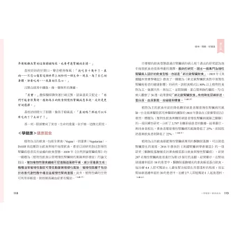 「王醫師以自身多年茹素的體驗,運用圖片故事的口吻,讓健康飲食變得可理解、可實踐,願你在這本書裡找到與自己健康重新對話的方式。」——彭清秀醫師(台北慈濟醫院教學部副主任、台北慈濟醫院腎臟內科)