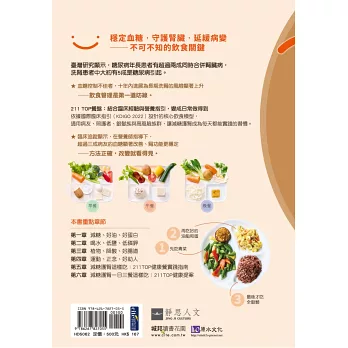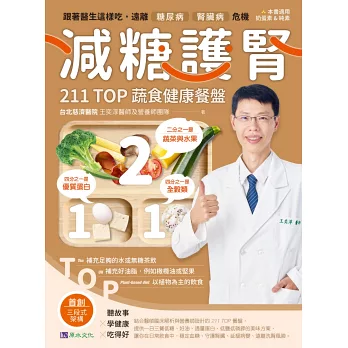 《減糖護腎211 TOP蔬食健康餐盤》一書涵蓋全面的健康理念, 包含「減糖、好油、好蛋白」、「喝水、低鹽、低磷鉀」、「植物、降酸、好腸道」以及「運動、正念、好助人」等四大面向,並結合211 TOP 餐盤,將艱澀的醫學概念化為日常可行的生活指引。書籍中穿插門診中的真實故事,將病人遭遇的困境與改善過程娓娓道來, 讓這本書不是冷冰冰的理論,而是帶有溫度、能引發共鳴的醫病智慧。