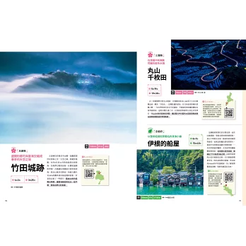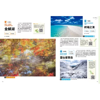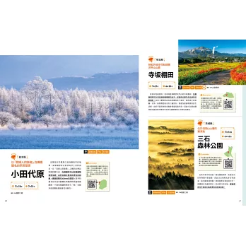 從北海道到沖繩,嚴選全日本47個都道府縣多達200個季節限定的拍攝景點。詳列拍攝日期、時間、光圈快門焦距等資訊,更附上實際拍攝地點的 QR Code,以簡潔優美的文字描述景點特色、何時順逆光、適合拍攝時段、角度等攝影注意事項,完整網羅55位攝影師為捕捉絕景所使用的各種技巧與經驗分享。