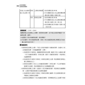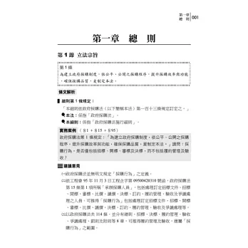 本書依政府採購法章節及條號編列,先對政府採購法條文解析,使讀者能直接由本書獲知政府採購法重要規定,再對實務案例提供建議意見,如實務案例(§31-Π-2§87-Ⅲ+§101-Ⅰ-1、2)表示涉及政府採購法「第31條第2項第2款」、「第87條第3項」及「第101條第1項第1款、第2款」等規定。