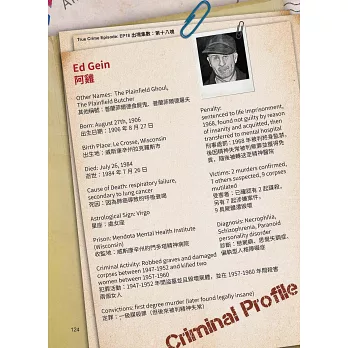包含連續殺人犯、人肉收割機、生存者、女性殺人犯、狂歡殺手、邪教共6種案件類別,收錄史上最窮凶惡極的知名罪犯,記述其生平背景、成長經歷、犯案動機、駭人聽聞的作案手法、被捕過程與最終判決。