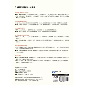 滿滿的犯罪檔案!生動的手繪肖像搭配清楚的犯罪背景與手法,每段故事沉重且深刻,直面變態的恐怖心理,還能學「變態系」英文,簡直不要太特別!推!──老Z│老Z調查線主持人
