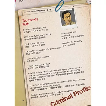 1. 連續殺人犯 Serial Killers:也稱連環殺手,指殺害三個或三個以上的人,殺害延續時間相當長且以分開事件發生。收錄史上赫赫有名的殺人魔,涵蓋高學歷變態渣男,連法官都能洗腦的阿泰 Ted Bundy、對血液癡狂到注射兔血,斷鳥頭喝血的瑞奇 Richard Chase、沈迷於BDSM,熱愛性虐待自大又自戀的殺手阿丹 Dennis Rader,最令人毛骨悚然的小丑殺手蓋西 John Wayne Gacy等。
